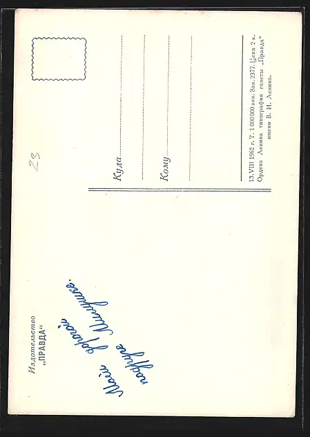 Personenbezogene Daten auf der Rückseite der Karte wurden durch blauen Textmarker unkenntlich gemacht. Die blauen Stellen sind auf die Vorderseite durchgeweicht und wirken sich negativ auf das Postkartenfoto aus