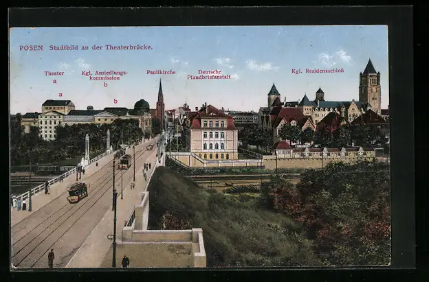 AK Posen, Stadtbild an der Theaterbrücke mit Strassenbahnen