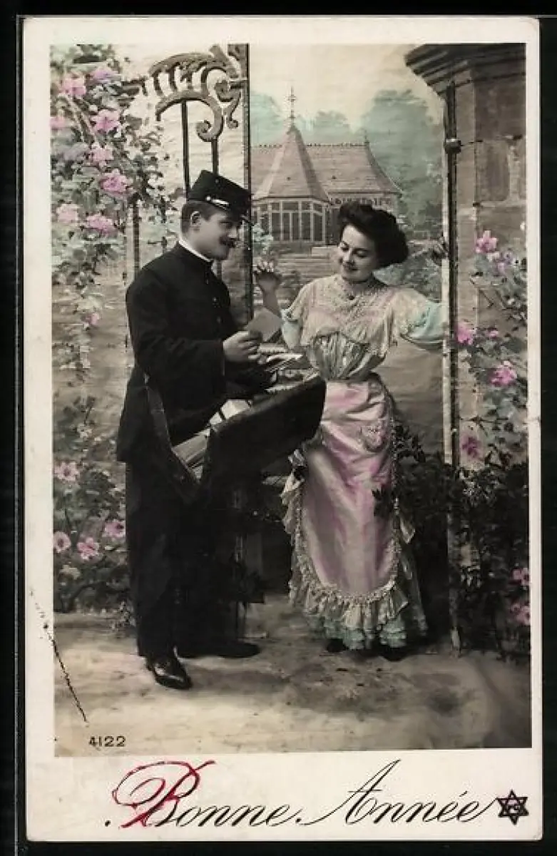 AK Postbote überbringt Frau einen Brief, Neujahrsgruss