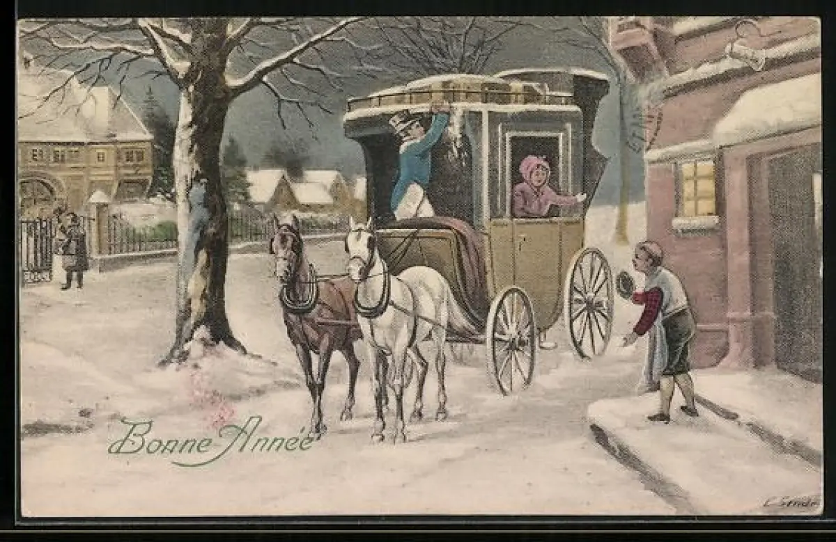 AK Postkutsche, Ankunft im Winter, Neujahrsgruss