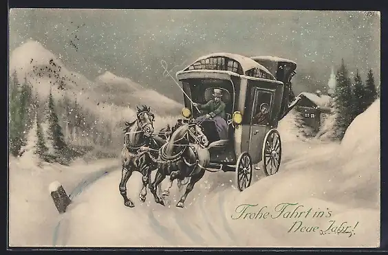 AK Postkutsche auf einer verschneiten Strasse, Neujahrsgruss