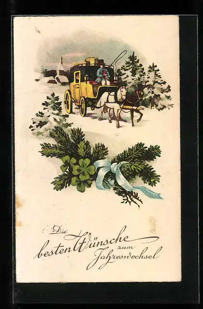 AK Postkutsche fährt durch den Schnee, Tannengrün u. Kleeblätter, Neujahr