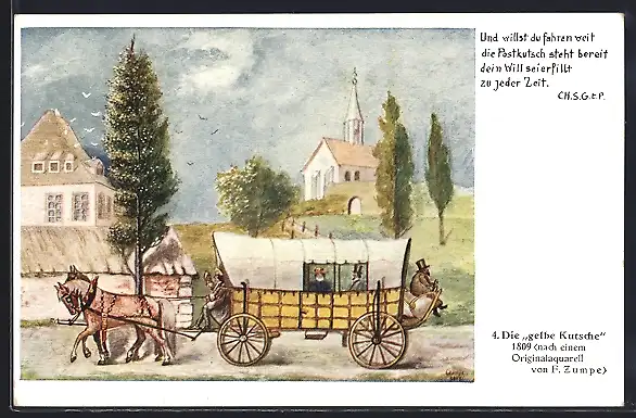 AK Postkutsche fährt mit Passagieren durch einen Ort