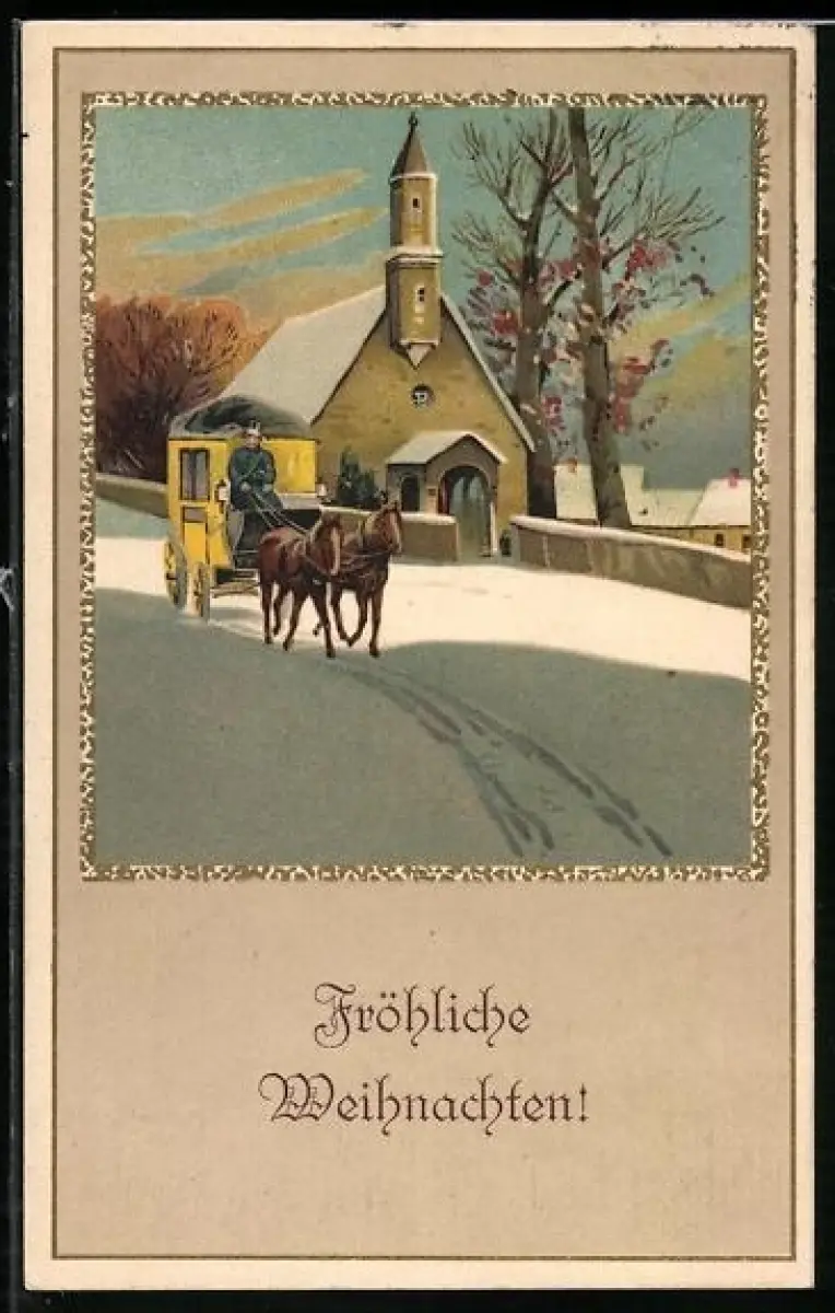 AK Postkutsche im Winter fährt an Kirche vorbei