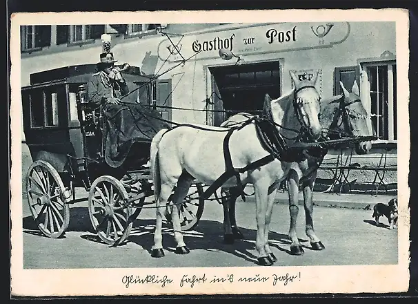 AK Postkutsche mit ins Horn blasendem Postillon vor einem Gasthof zur Post, Neujahrsgruss