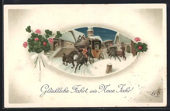 AK Postkutschen preschen durch einen Ort, Neujahrsgruss