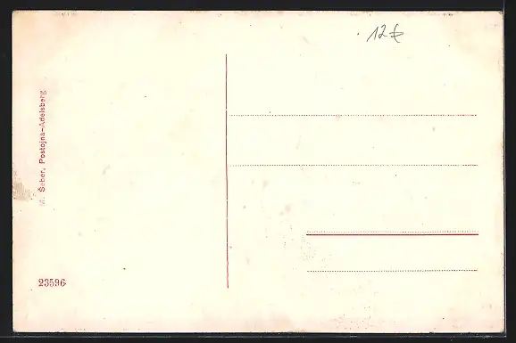 Personenbezogene Daten auf der Rückseite der Karte wurden durch blauen Textmarker unkenntlich gemacht. Die blauen Stellen sind auf die Vorderseite durchgeweicht und wirken sich negativ auf das Postkartenfoto aus