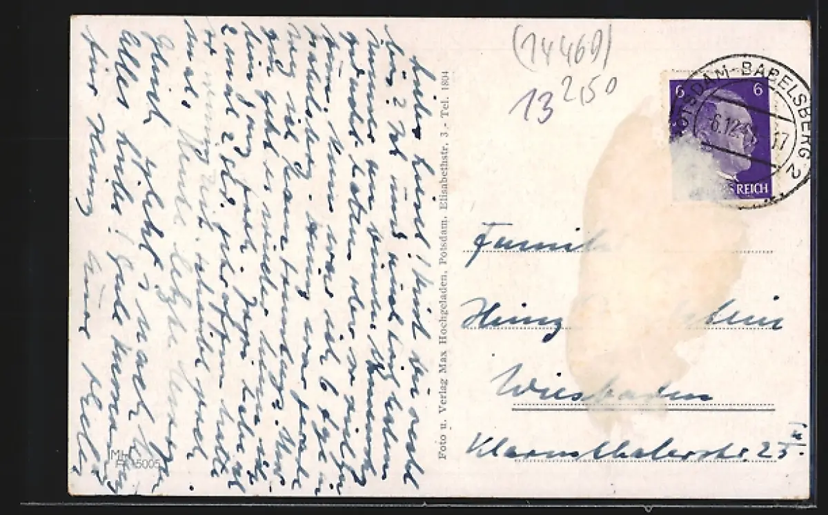 Personenbezogene Daten auf der Rückseite der Karte wurden durch blauen Textmarker unkenntlich gemacht. Die blauen Stellen sind auf die Vorderseite durchgeweicht und wirken sich negativ auf das Postkartenfoto aus