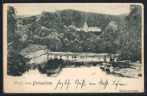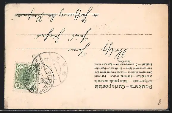Personenbezogene Daten auf der Rückseite der Karte wurden durch blauen Textmarker unkenntlich gemacht. Die blauen Stellen sind auf die Vorderseite durchgeweicht und wirken sich negativ auf das Postkartenfoto aus
