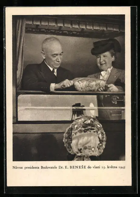 AK Präsident Edvard Benes nebst Gattin im Zug beim Anschneiden eines Laibes Brot