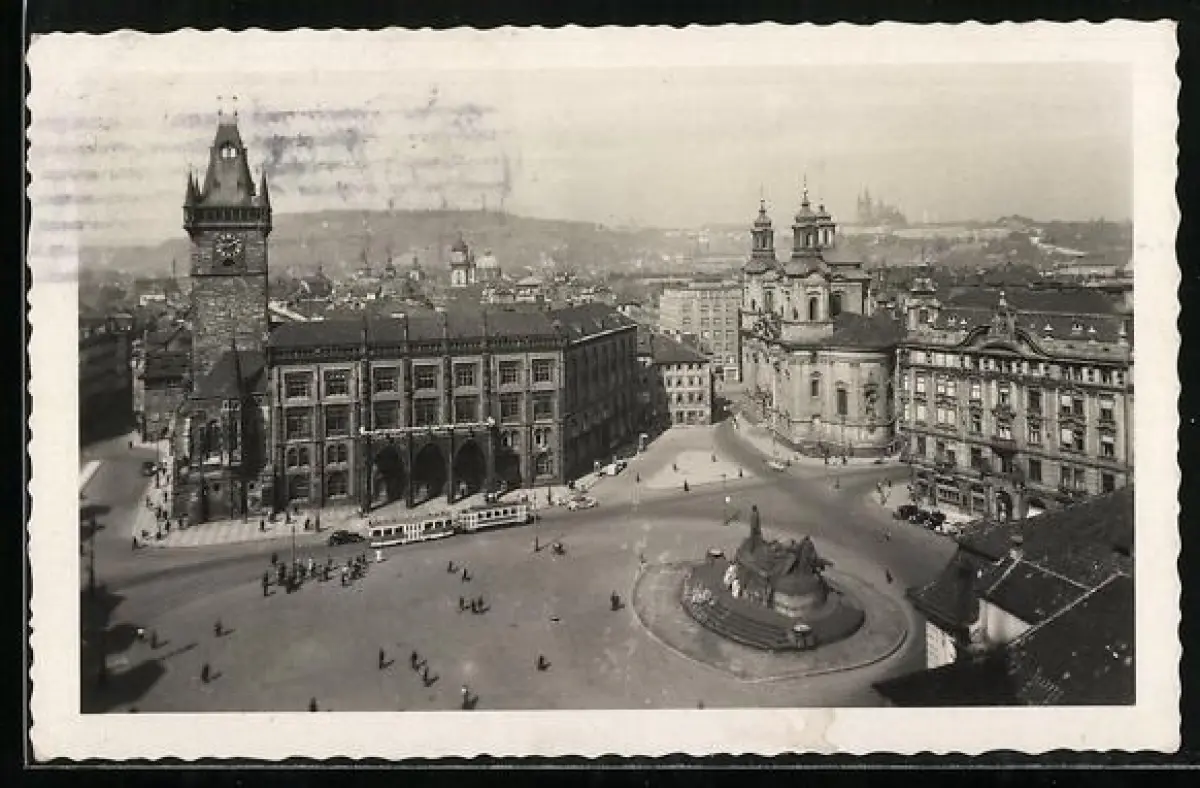AK Prag, Altstädter Ring mit Denkmal u. Strassenbahn aus der Vogelschau