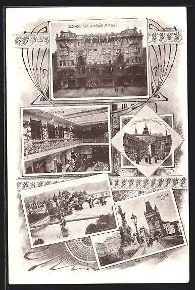 AK Prag / Praha, Obchodni dum J. Novak, Oddeleni suken, Tri mosty, Mostecká véz