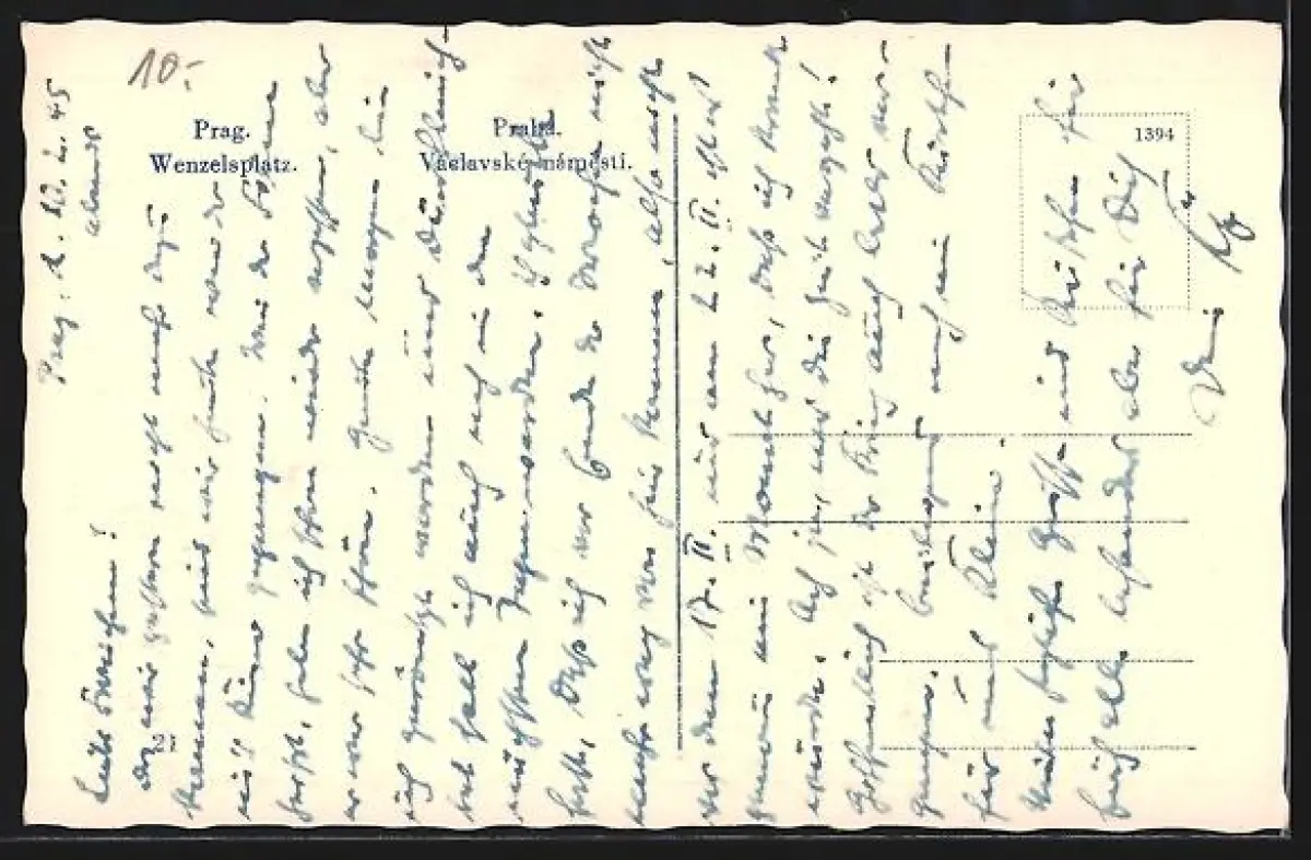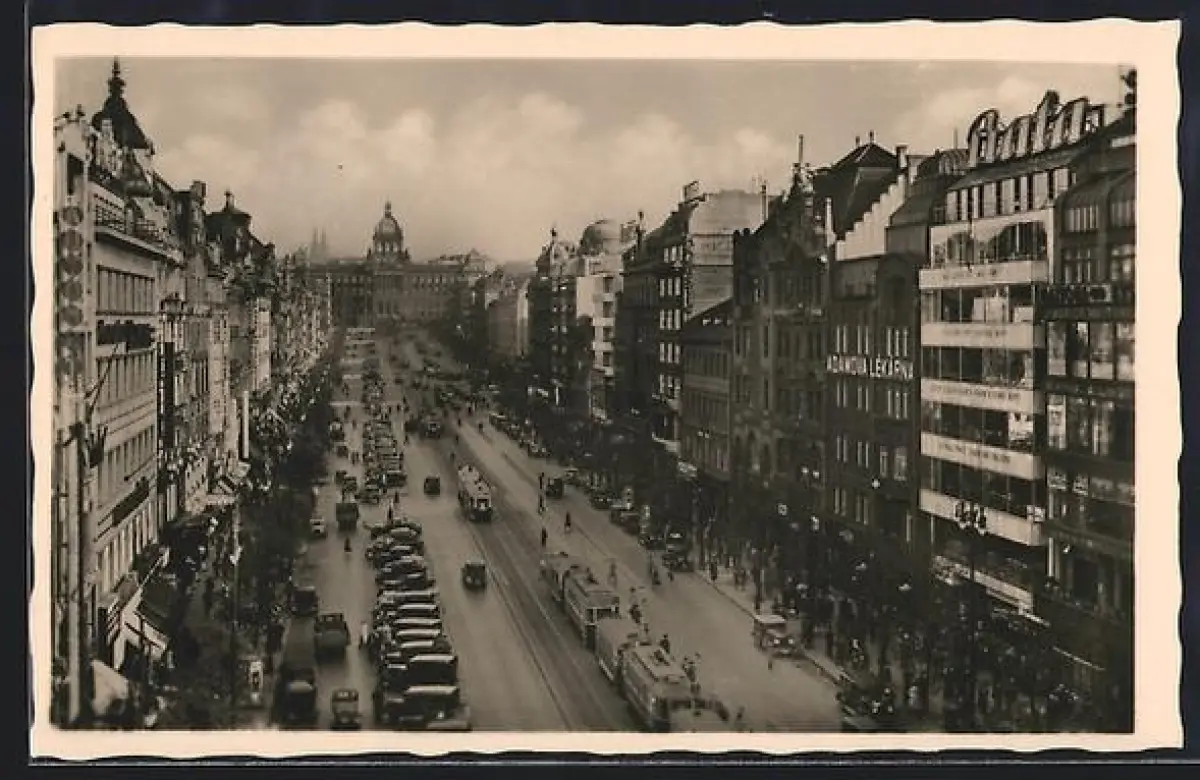AK Prag, Wenzelsplatz mit Strassenbahn aus der Vogelschau
