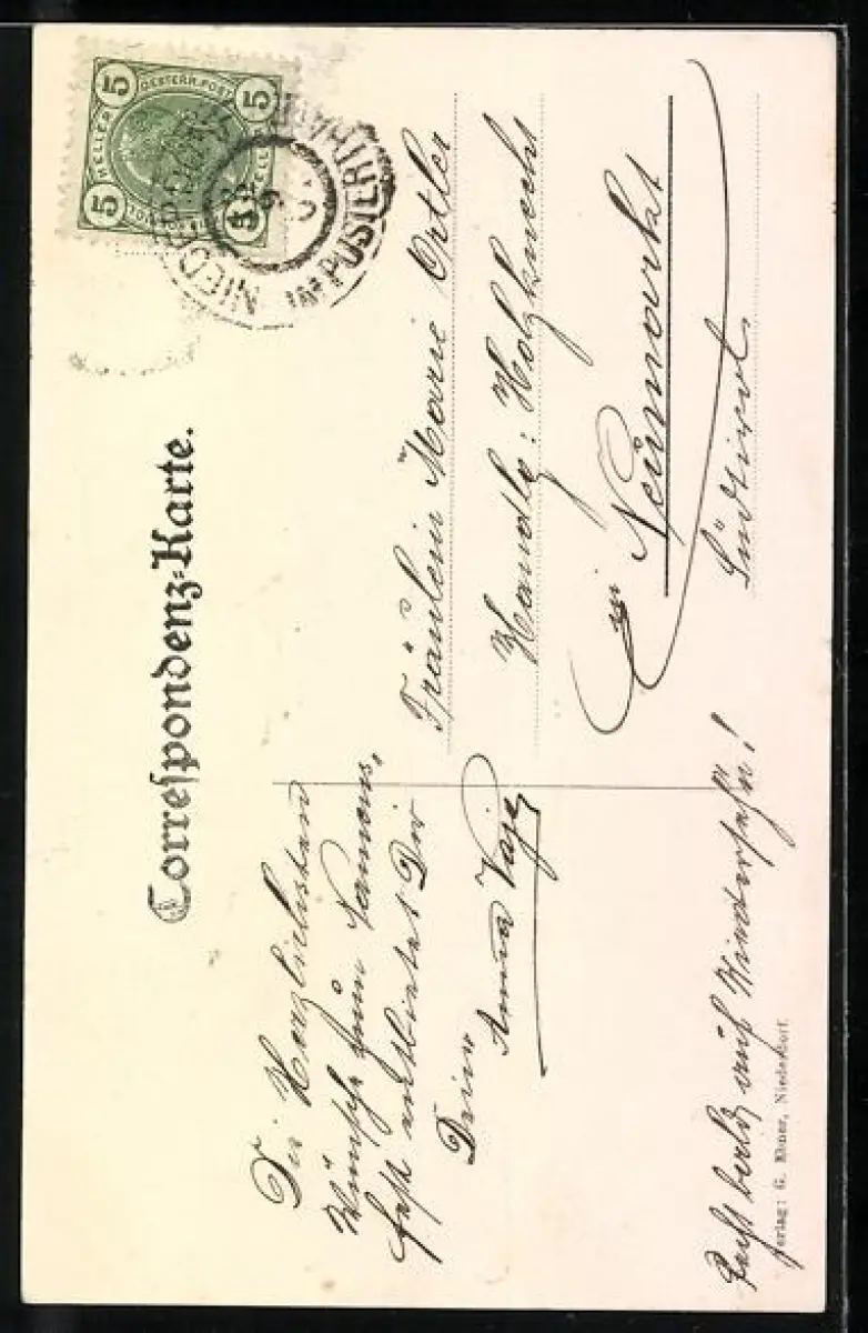Personenbezogene Daten auf der Rückseite der Karte wurden durch blauen Textmarker unkenntlich gemacht. Die blauen Stellen sind auf die Vorderseite durchgeweicht und wirken sich negativ auf das Postkartenfoto aus