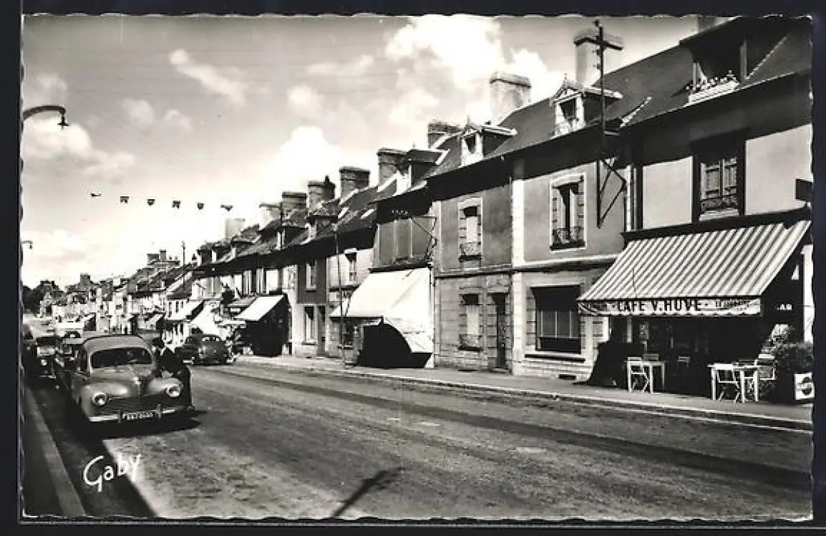 AK Pré-en-Pail /Mayenne, Rue Aristide-Briand avec voitures et café