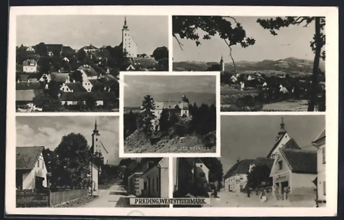 AK Preding, Schloss Hornegg, Strassenpartie an der Kirche, Ortsansicht