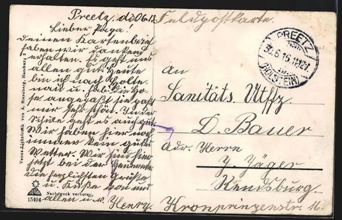 Personenbezogene Daten auf der Rückseite der Karte wurden durch blauen Textmarker unkenntlich gemacht. Die blauen Stellen sind auf die Vorderseite durchgeweicht und wirken sich negativ auf das Postkartenfoto aus