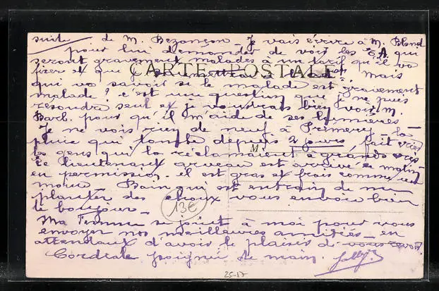 Personenbezogene Daten auf der Rückseite der Karte wurden durch blauen Textmarker unkenntlich gemacht. Die blauen Stellen sind auf die Vorderseite durchgeweicht und wirken sich negativ auf das Postkartenfoto aus