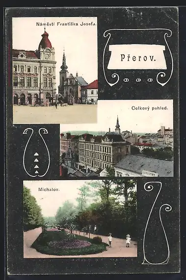 AK Prerau, Marktplatz mit Lauben und Kirche, Blick über die Dächer des Ortes