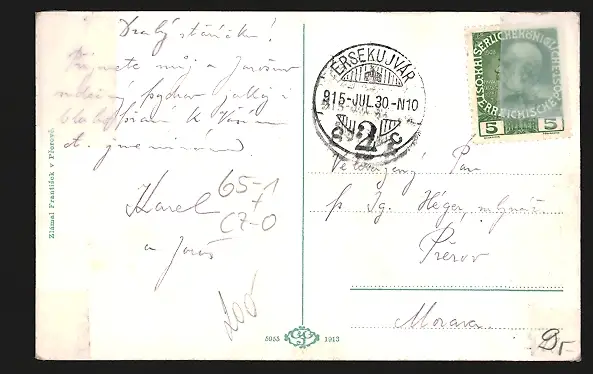gelaufen 1915, vorder- u. rückseitig Klebe- und Papierreste, Eckknicke oben, guter Zustand