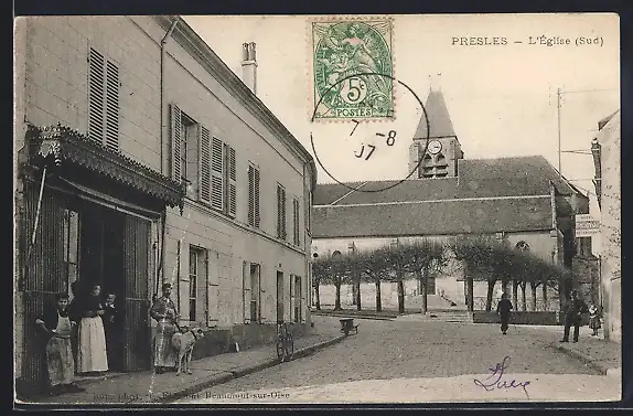 AK Presles, L`église vue du sud avec rue animée et habitants
