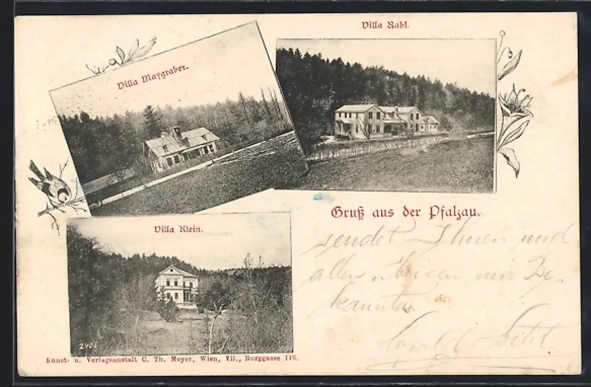 AK Pressbaum, Gruss aus der Pfalzau, Villa Maygraber, Villa Rabl, Villa Klein