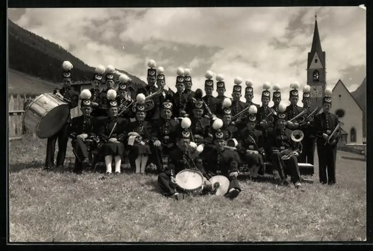 AK Prettau, Musikkapelle Prettau in traditionellen Uniformen vor der Kirche
