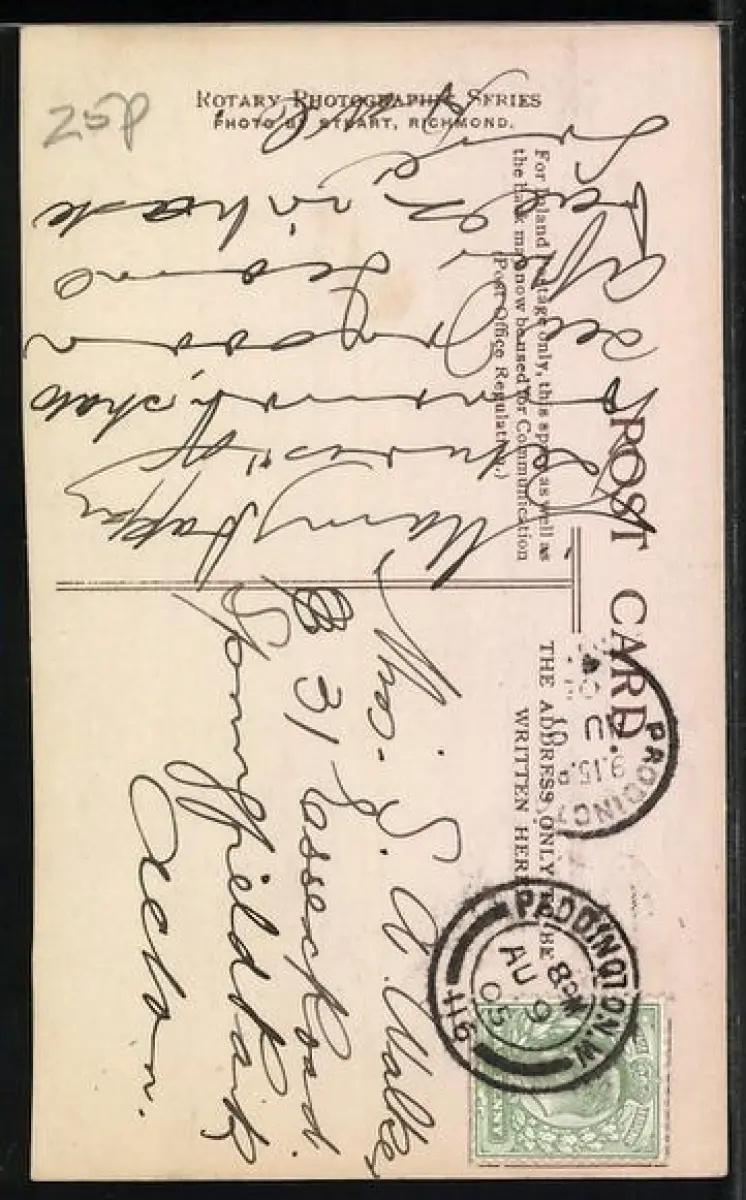 Personenbezogene Daten auf der Rückseite der Karte wurden durch blauen Textmarker unkenntlich gemacht. Die blauen Stellen sind auf die Vorderseite durchgeweicht und wirken sich negativ auf das Postkartenfoto aus