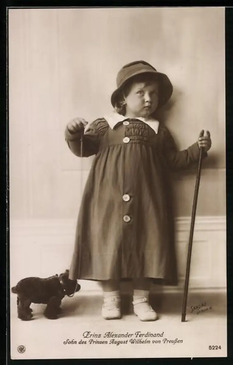 AK Prinz Alexander Ferdinand mit Stock und Stofftierhund an der Leine, Sohn d.Prinzen August Wilhelm von Preussen