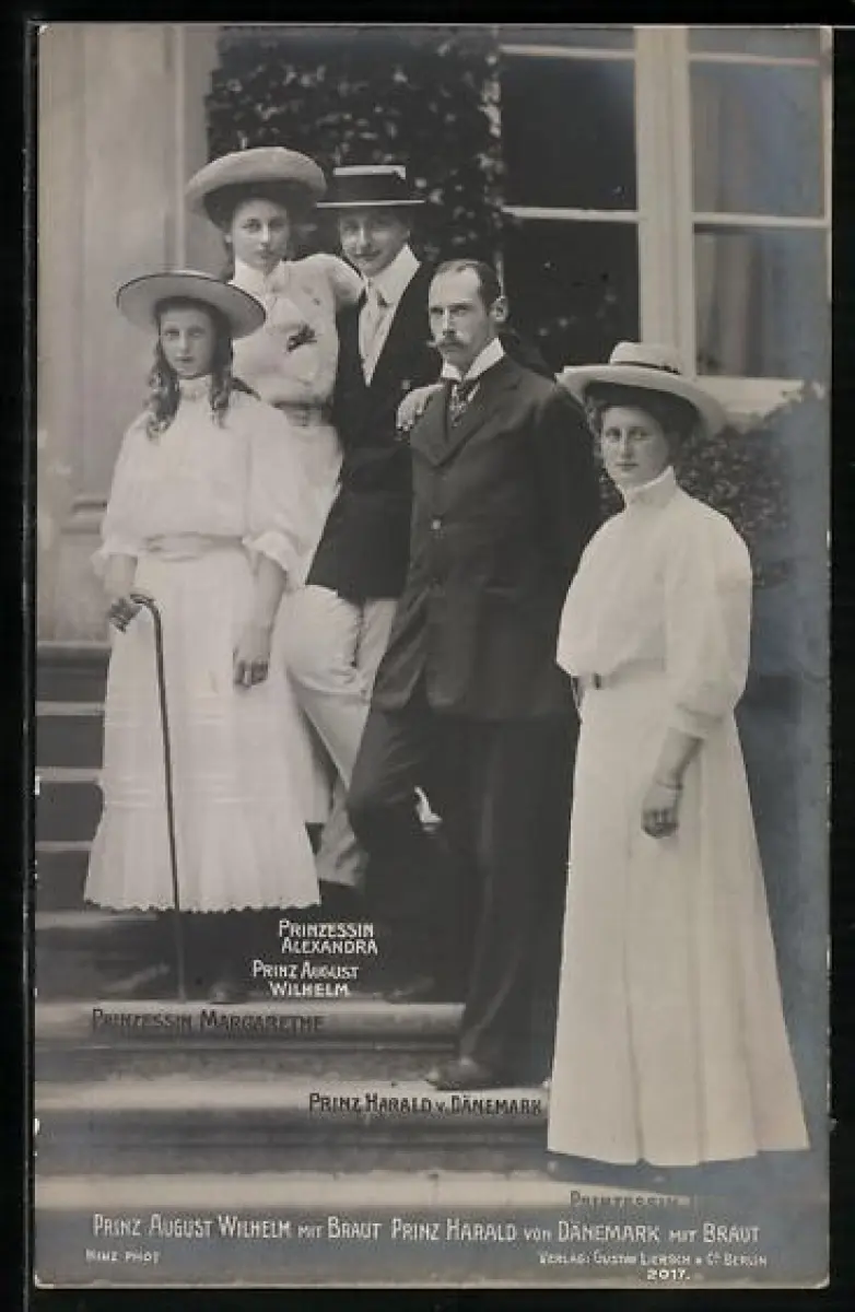 AK Prinz August Wilhelm mit Braut und Prinz Harald von Dänemark mit Braut