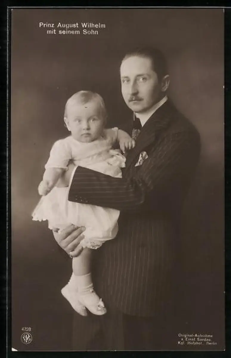 AK Prinz August Wilhelm von Preussen im Anzug hält seinen Sohn im Arm