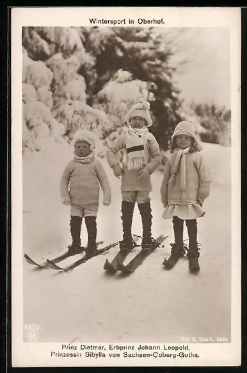 AK Prinz Dietmar, Erbprinz Johann Leopold, Prinzessin Sibylla von Sachsen-Coburg-Gotha auf Ski