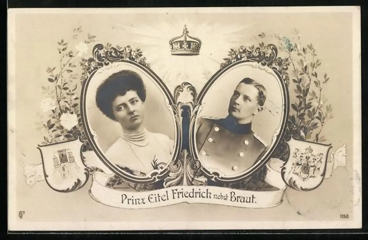 AK Prinz Eitel Friedrich von Preussen nebst Braut, Krone, Wappen