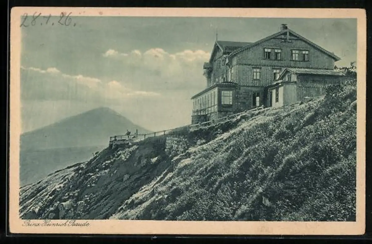AK Prinz-Heinrich-Baude /Riesengebirge, Besucher auf der Aussichtsplattform