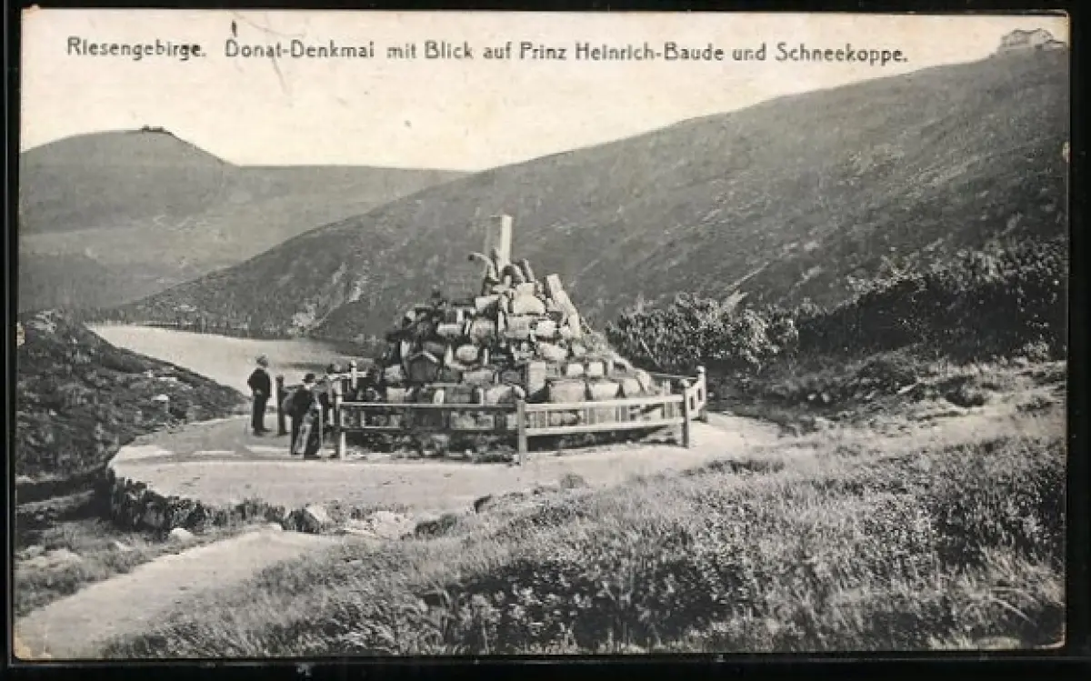 AK Prinz Heinrich-Baude /Riesengebirge, Donat-Denkmal mit Schneekoppe