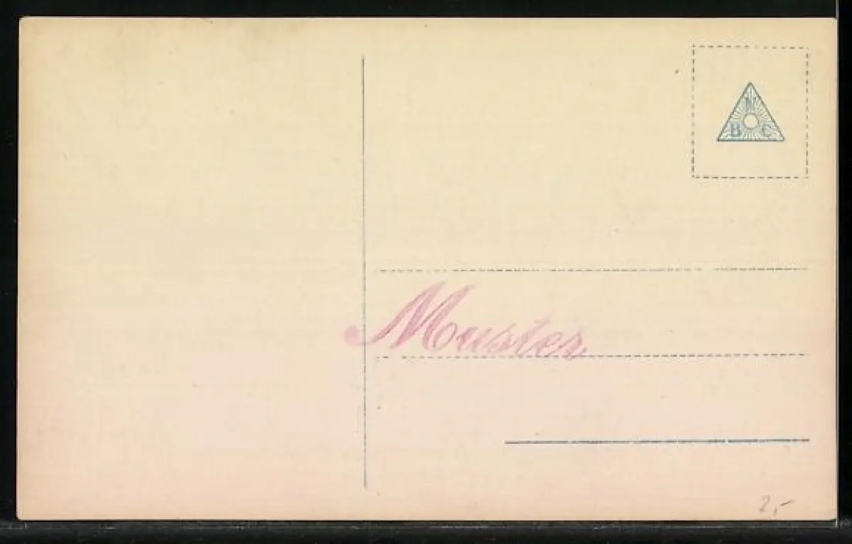 Personenbezogene Daten auf der Rückseite der Karte wurden durch blauen Textmarker unkenntlich gemacht. Die blauen Stellen sind auf die Vorderseite durchgeweicht und wirken sich negativ auf das Postkartenfoto aus