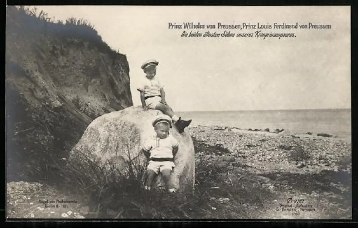 AK Prinz Wilhelm und Prinz Louis Ferdinand von Preussen in Matrosenuniformen mit Mützenband am Strand