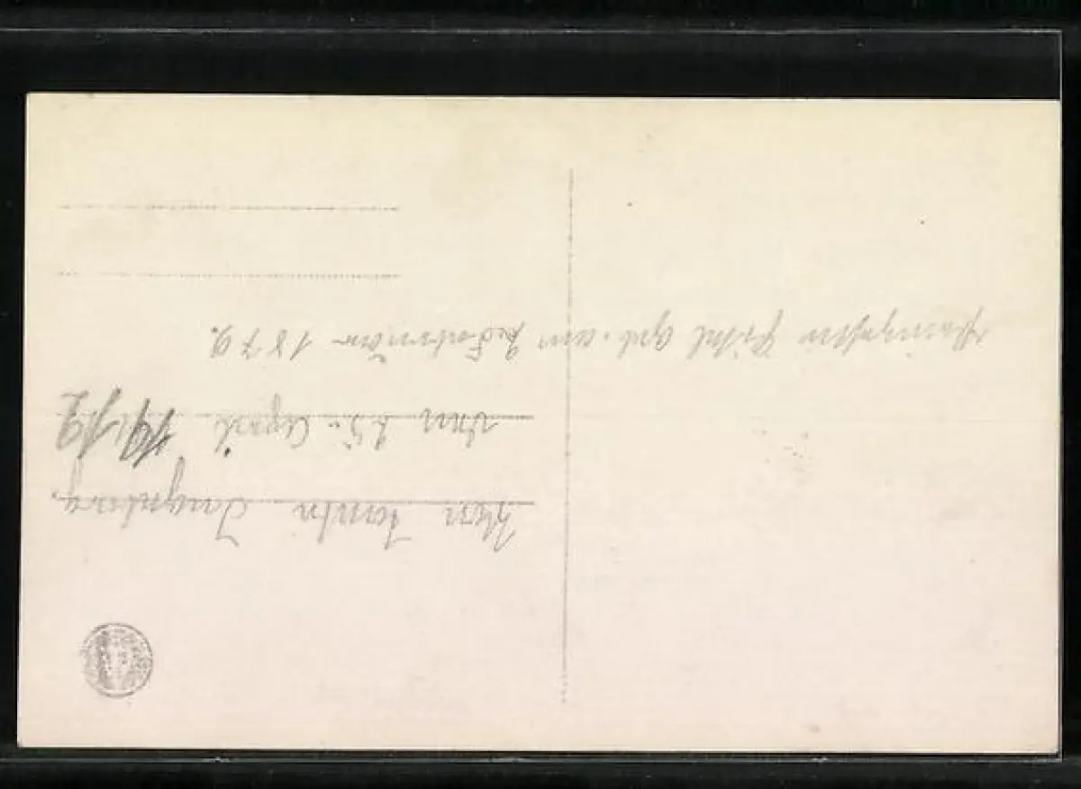 Personenbezogene Daten auf der Rückseite der Karte wurden durch blauen Textmarker unkenntlich gemacht. Die blauen Stellen sind auf die Vorderseite durchgeweicht und wirken sich negativ auf das Postkartenfoto aus