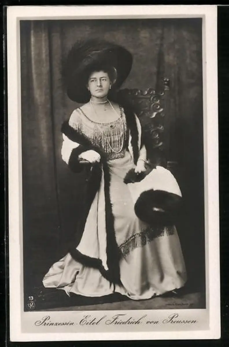 AK Prinzessin Eitel Friedrich von Preussen im Kleid mit Pelzmantel auf einem Thron