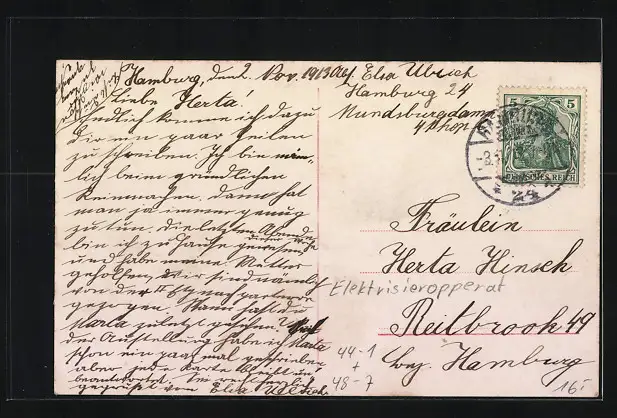 Personenbezogene Daten auf der Rückseite der Karte wurden durch blauen Textmarker unkenntlich gemacht. Die blauen Stellen sind auf die Vorderseite durchgeweicht und wirken sich negativ auf das Postkartenfoto aus