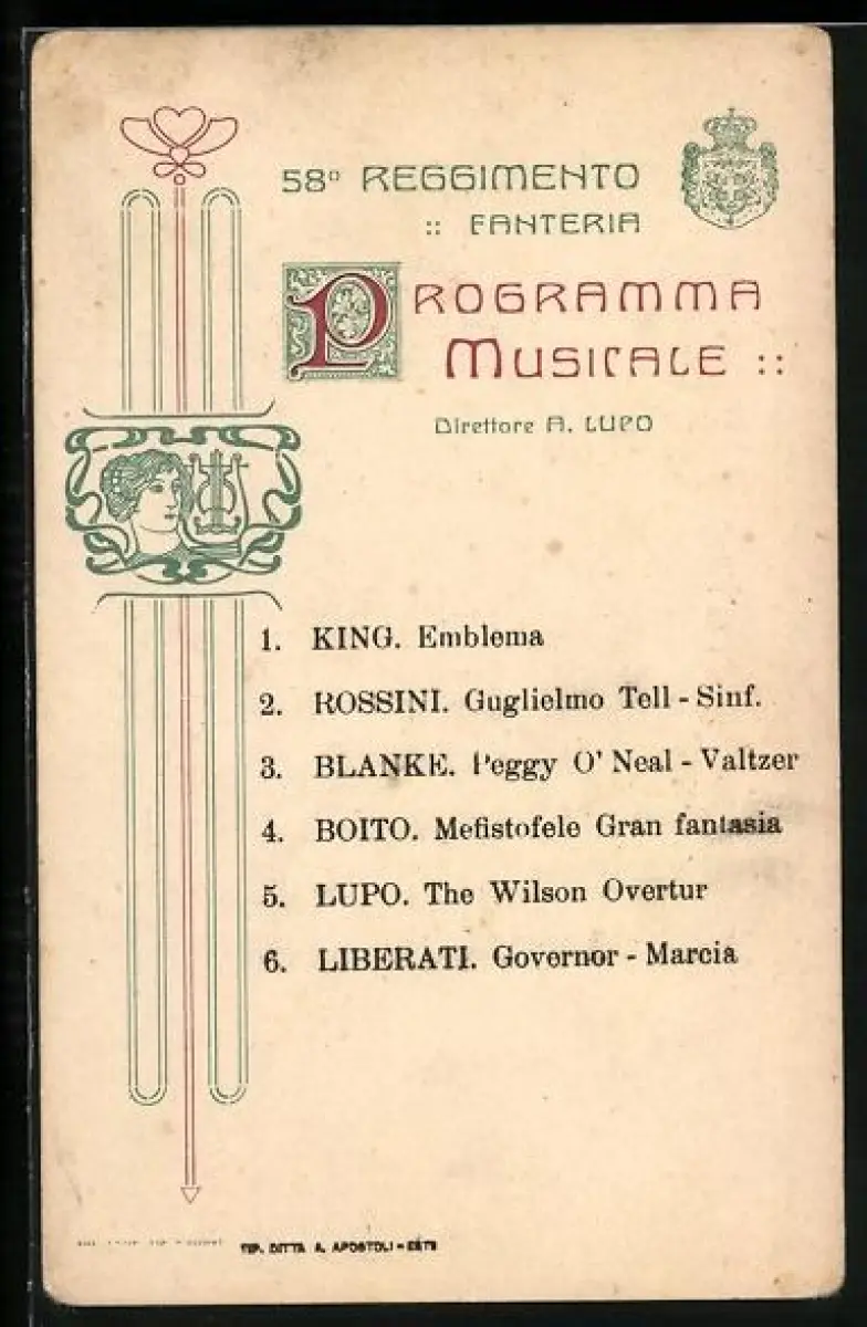 AK Programma Musicale, 58o Reggimento Fanteria, King: Emblema, Rossini: Guglielmo Tell-Sinf., Infanterie-Regiment