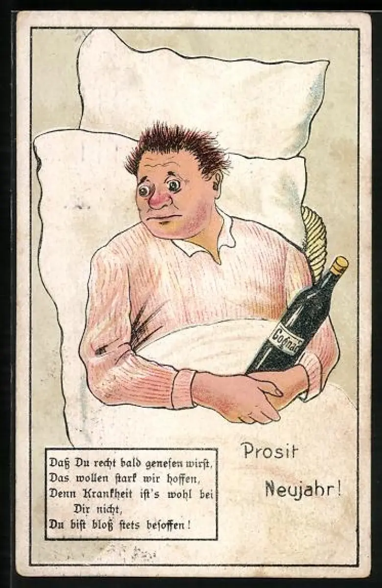AK Prosit Neujahr, Dass Du recht bald wirst genesen..., Kranker mit Flache Cognac und Glupschaugen