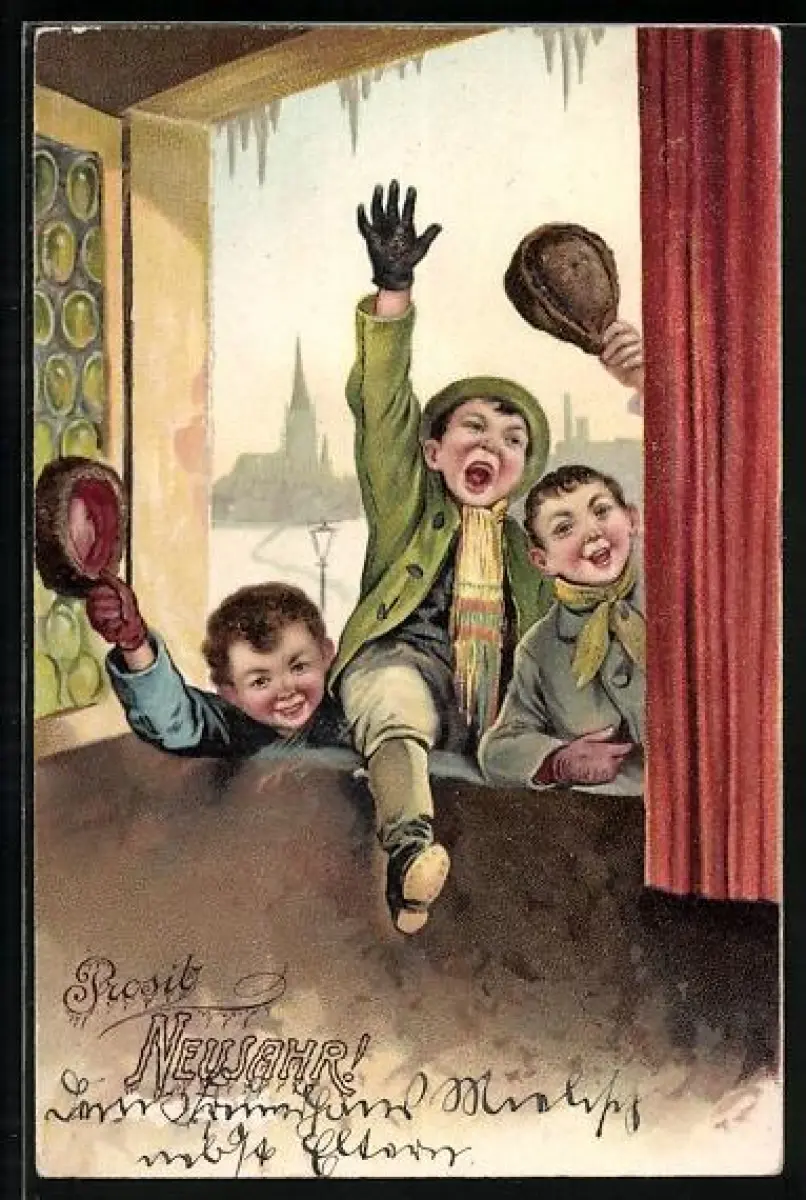 AK Prosit Neujahr, Drei Jungen winken am Fenster