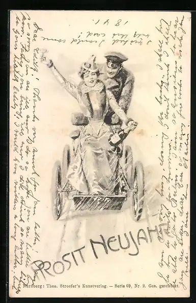 AK Prosit Neujahr, Ein Paar auf Spritztour mit Sektflasche