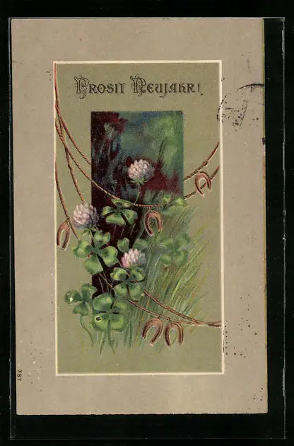 AK Prosit Neujahr, Hufeisen und Kleeblätter