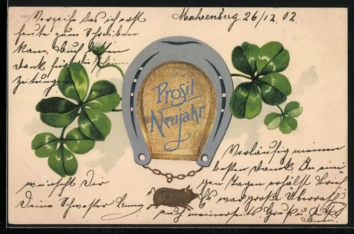 AK Prosit Neujahr, Hufeisen und Kleeblätter