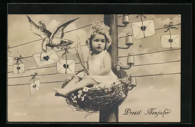 AK Prosit Neujahr, Kind sitzt im Vogelnest an einem Strommast