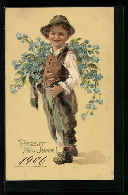 AK Prosit Neujahr!, Knabe mit Hut und Vergissmeinnicht
