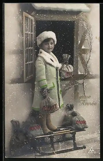 AK Prosit Neujahr, Mädchen im Pelzmantel gibt Geldsäcke durchs Fenster, Schlitten