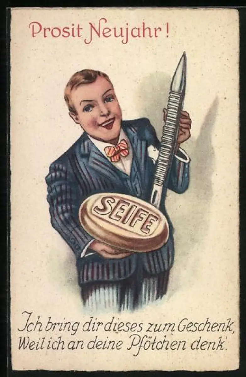 AK Prosit Neujahr, Mann bringt Seife als Geschenk, Scherz